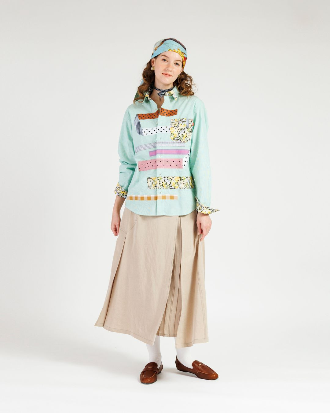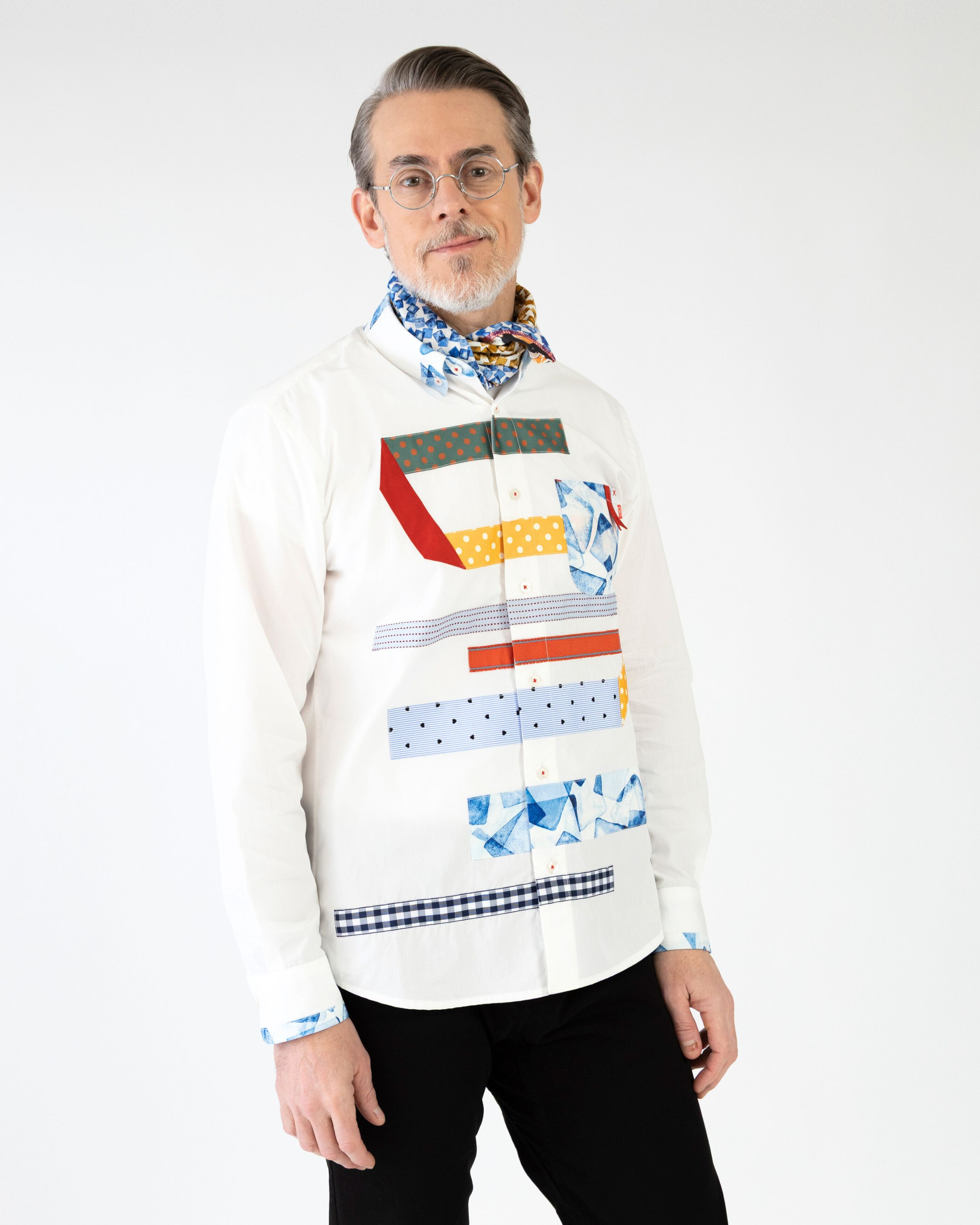 幾何学柄など異なるテキスタイルを組み合わせ、